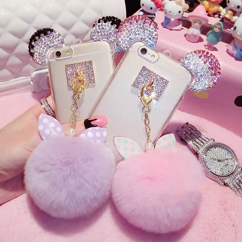 Main Features : New Luxury 3D Crystal Mickey Ears Bowknot Fur Ball Phone Cases For iPhone 6 6S 6/6S Plus Soft TPU Phone Bags Back Cover Capa